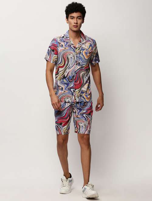 SHOWOFF Men's Shirt Collar Blue Printed Co-Ords Set
