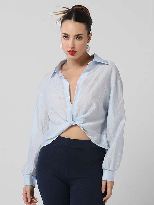 SHOWOFF Classic Women's Blue Solid Shirt Style Crop Top