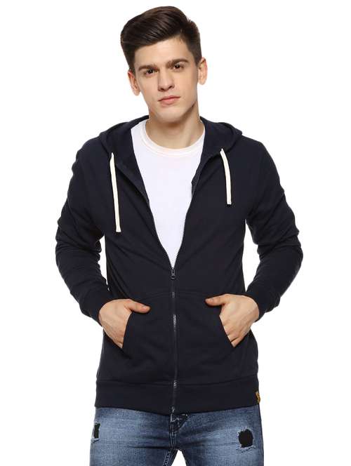 - » navy blue solid hooded casual jacket