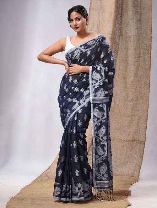 This blue cotton handwoven saree is intertwined with comfort and style. It has texture motifs woven all over. The borders and pallu have jamdani design and the pallu is also highlighted with stripes to compliments the look beautifully.