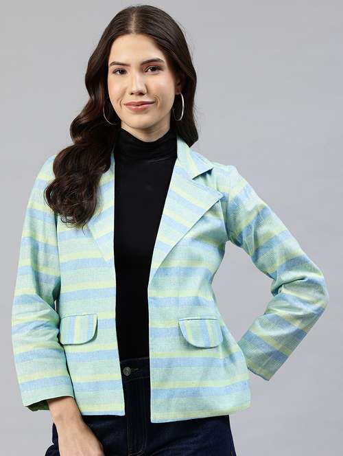 Blue and Green striped regular-fit blazer, has a notched lapel collar, long sleeves, single-breasted with front open , 2 pockets and attached lining