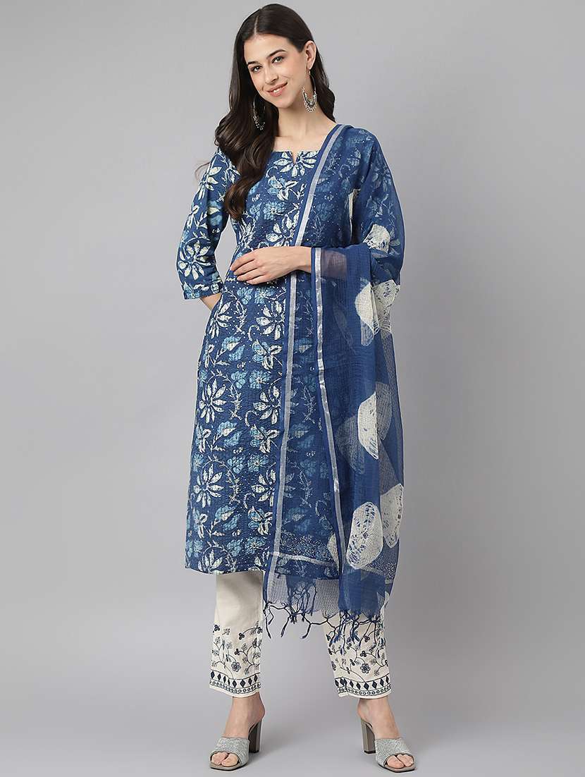 blue printed kurta pant set with dupatta