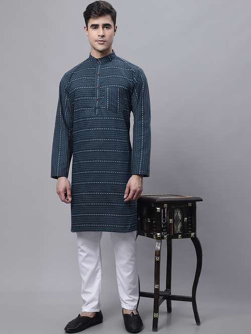 Enchanted Drapes Blue Printed Cotton Men's Long Kurta