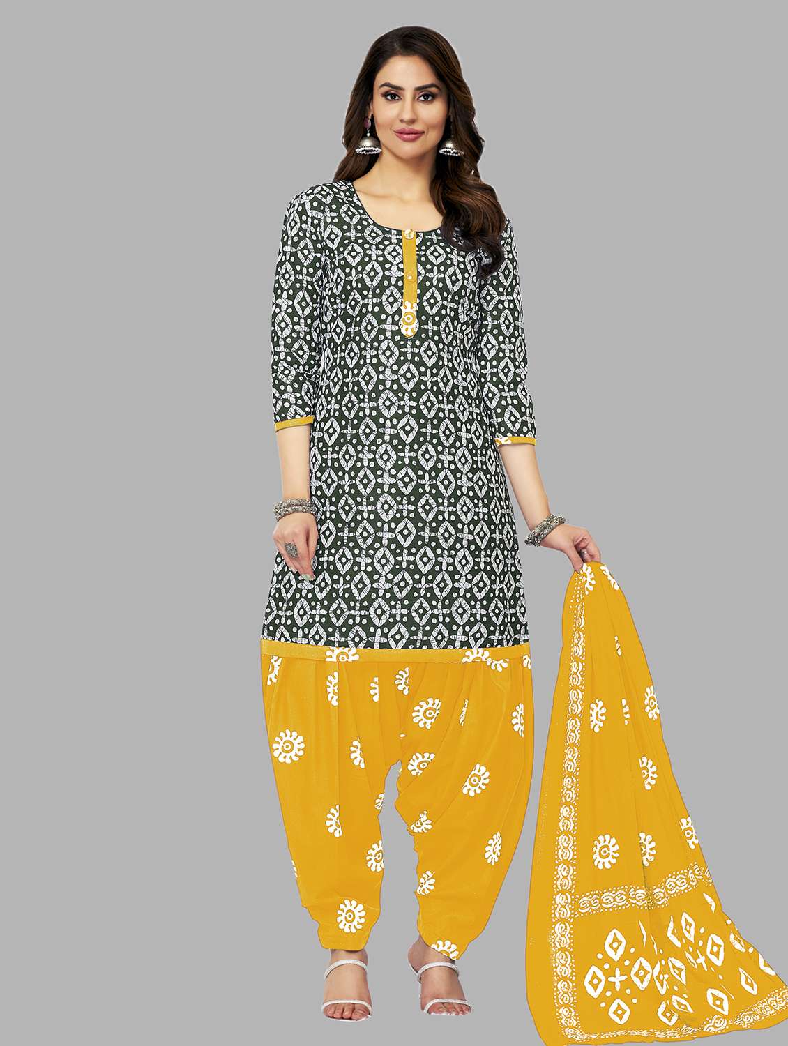 - Look ultra gorgeous in unstitched suits from Ganpati Cotton Suits and grab these beautiful suits in yellow colour.