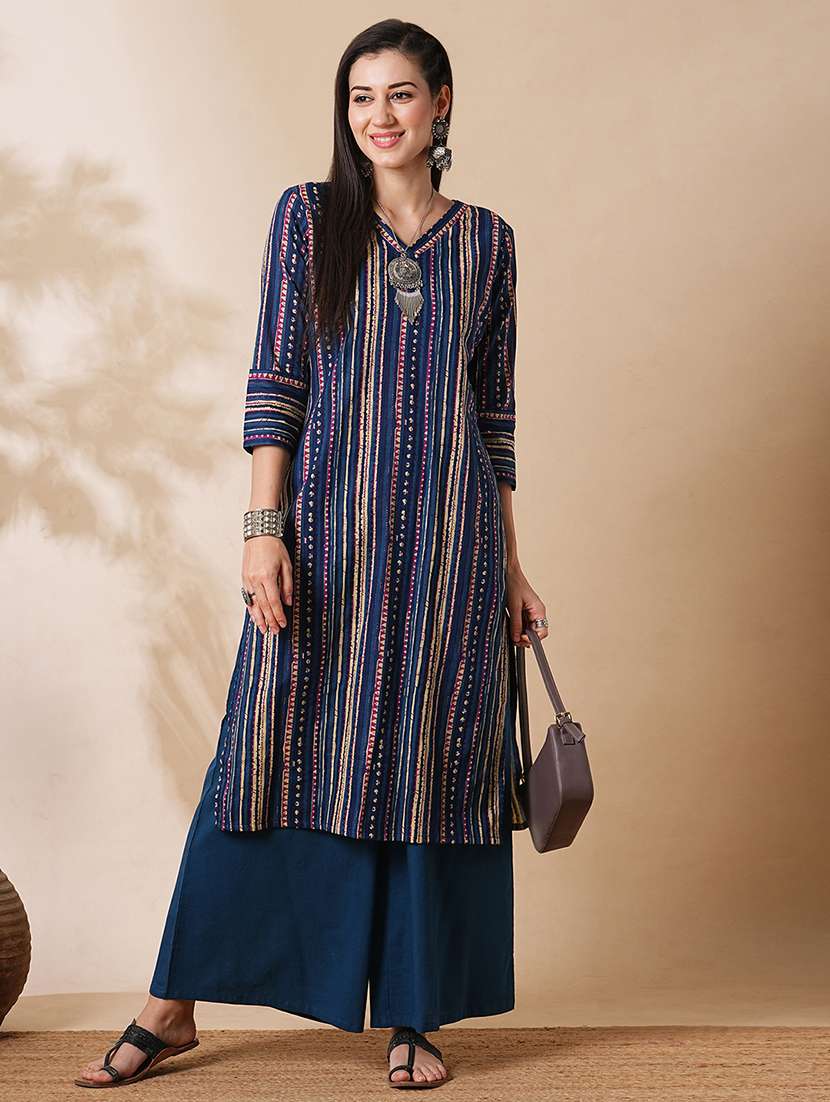 - » globus women blue allover geometric stripe printed straight workwear kurta with palazzos set