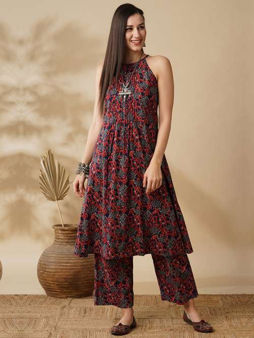 globus women blue floral printed halter neck flared hem a-line workwear kurta & trouser set