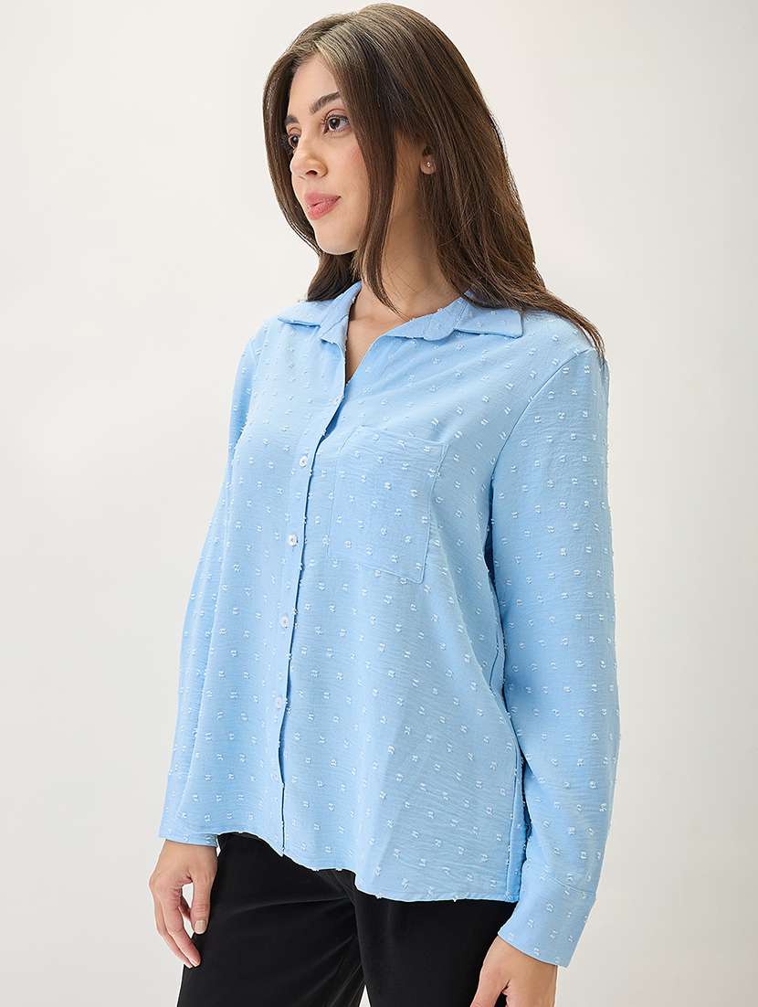 globus women blue cuffed sleeves self design chest pocket curved hem shirt