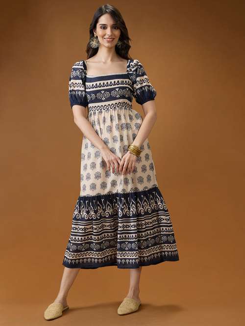 - » globus women blue square neck puff sleeves ethnic print smocked tiered fit & flare midi dress