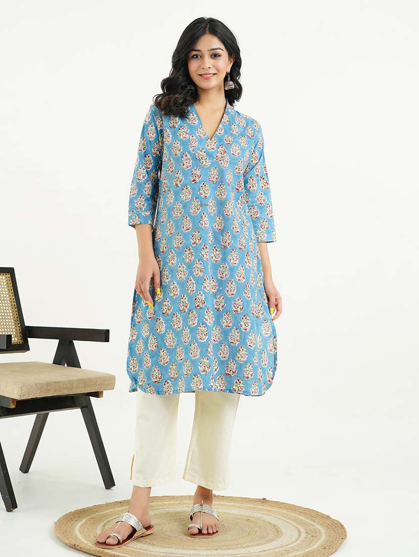 - Grab this beautiful kurta made up of cotton fabric featuring v neck neck designs.