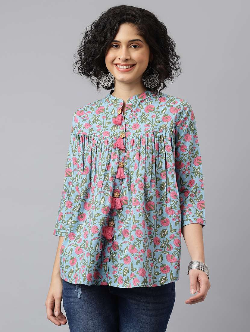 Elevate your everyday wardrobe with the JAIPURATTIRE Women's Floral Printed Cotton Top. This exquisitely designed top combines comfort and style, making it a must-have for any fashion-forward woman. Crafted from 100% pure cotton, it ensures a breathable and lightweight feel, perfect for all-day wear. The floral print adds a touch of elegance, while the elasticated sleeves provide a relaxed fit that allows for effortless movement.This versatile top transitions seamlessly from casual outings to more polished events. Whether you're heading to work, meeting friends for coffee, or enjoying a leisurely day at home, this top offers the perfect blend of sophistication and comfort. The easy-care fabric is hand washable, ensuring that the vibrant print and quality construction remain intact wash after wash.With its classic round neck and three-quarter sleeves, this top is designed to flatter various body types. Pair it with your favorite jeans, skirts, or trousers for a chic and put-together look. Handcrafted with attention to detail, the JAIPURATTIRE Women's Floral Printed Cotton Top is a testament to timeless style and exceptional craftsmanship. Add this versatile piece to your collection and experience the perfect balance of fashion and function.