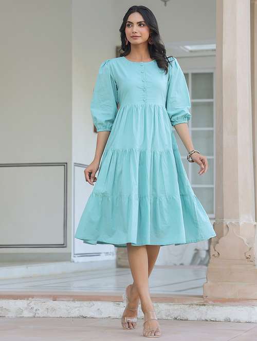 - » women light blue solid round neck tiered dress