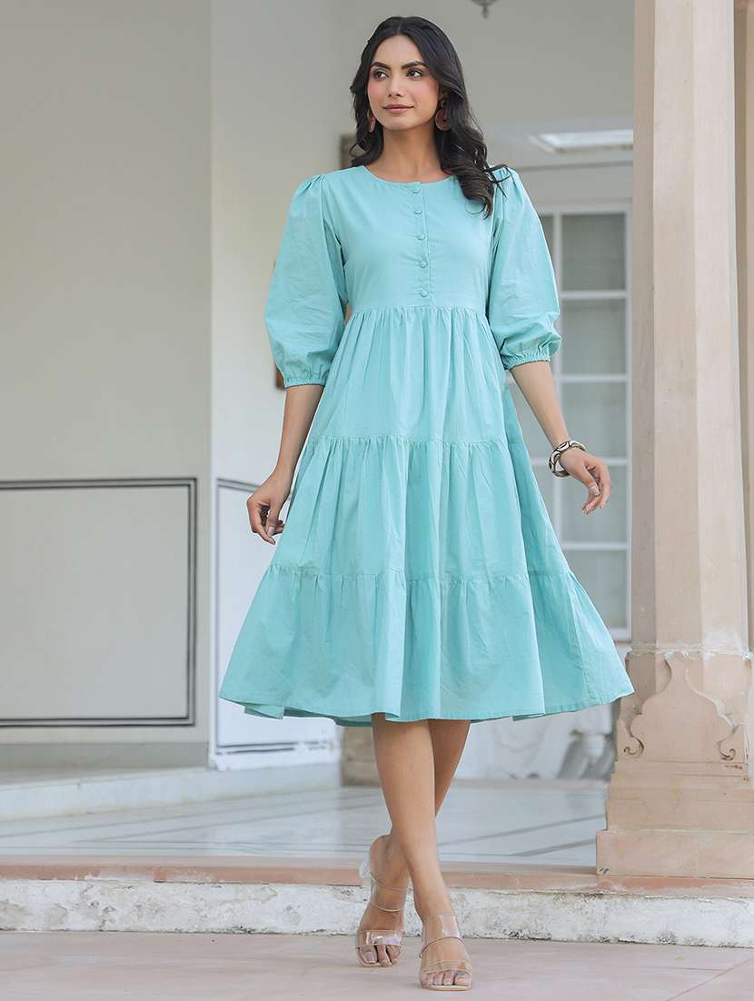 women light blue solid round neck tiered dress