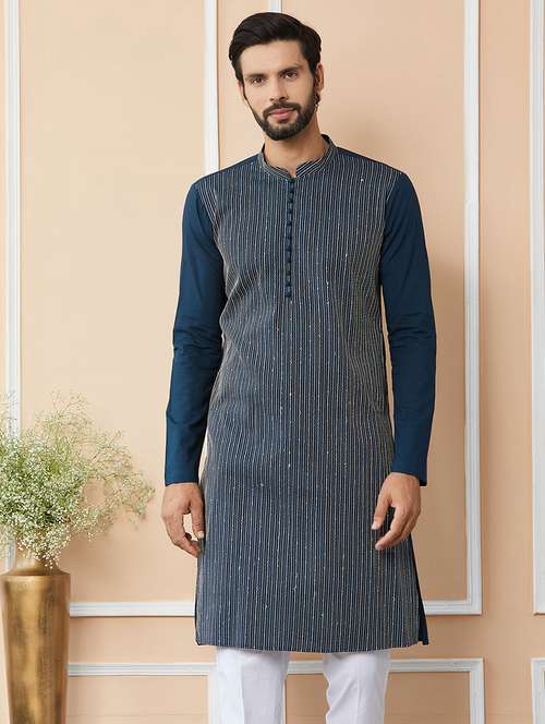 - » men solid with work mandarin neck long kurta