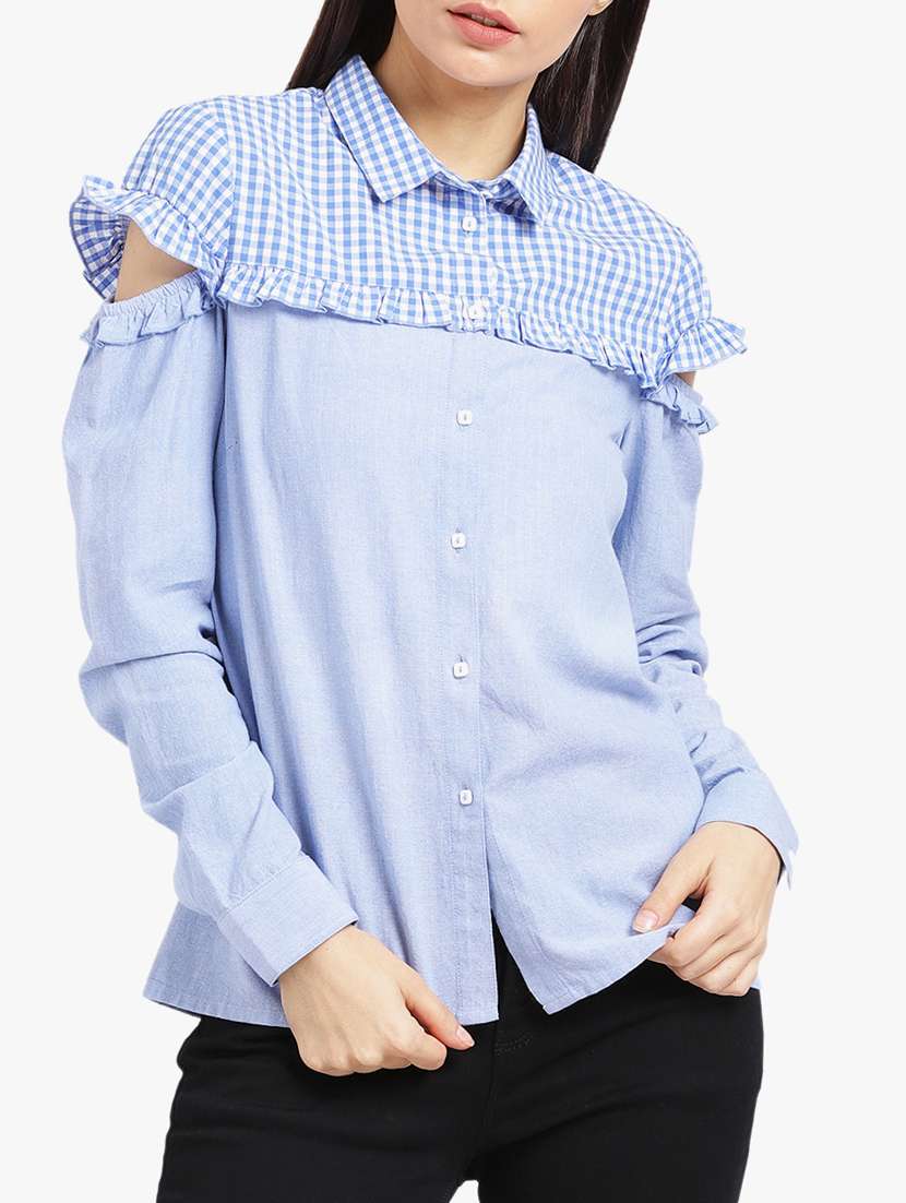 - » checkered yoke ruffle detail shirt