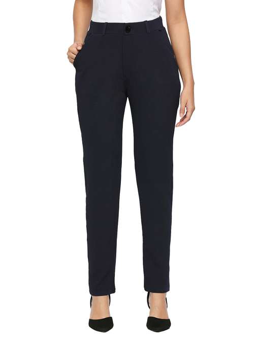 Feel compact & comfortable all day long. These straight fit formal trouser in blooming navy blue will give you sharp look. it's high waist fitting, cotton lycra fabric will make you feel easy.