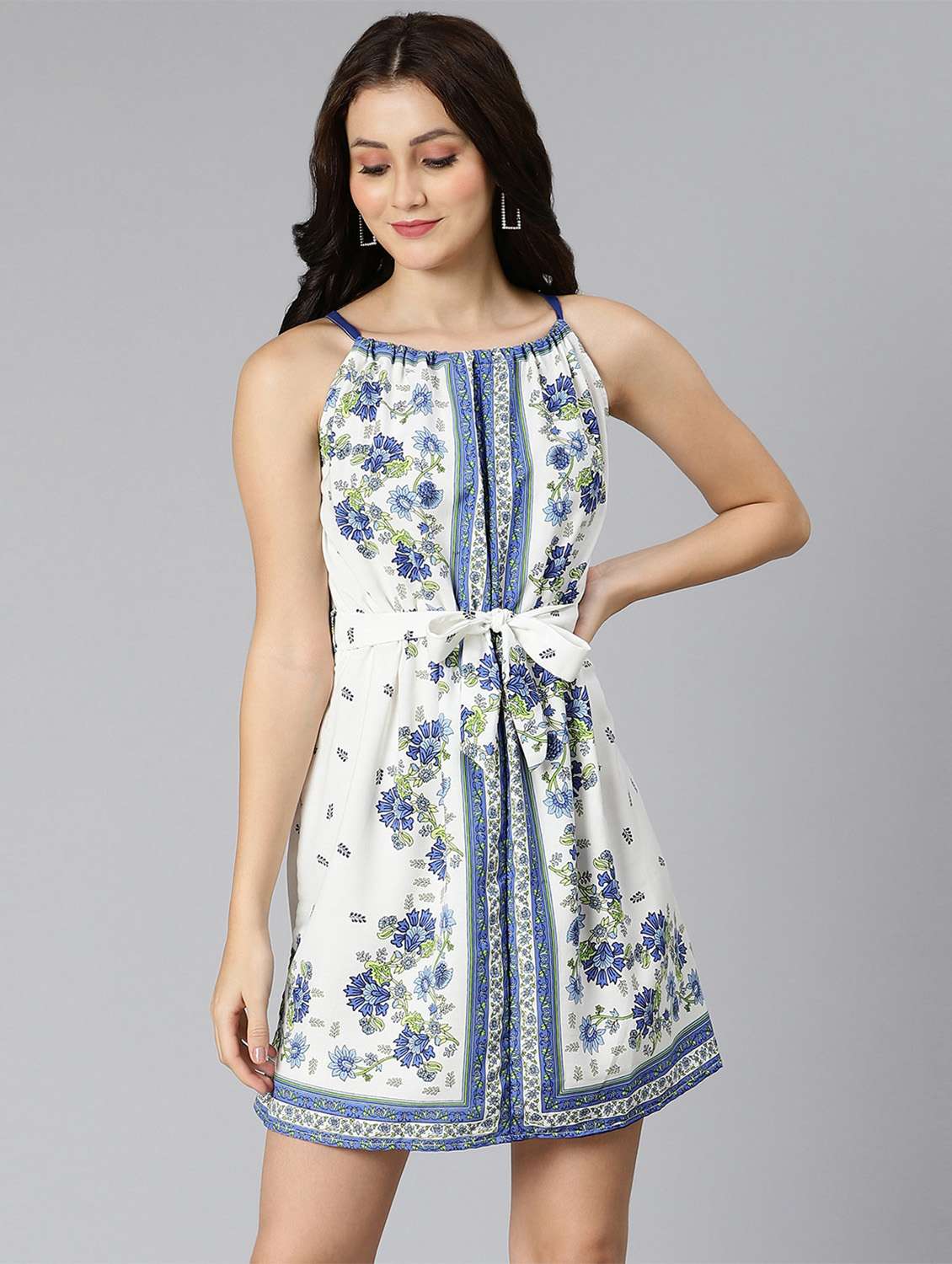 Look charming and graceful wearing Admiral blue floral scarf printed tie-knotted women dress, made with viscose fabric, consists rich quality modern style and all prettiness in one go. It is decked up with an all-over floral print, and a round neck with shoulder straps. tie-knot belt to highlight the waist look and flared hem with above knee length. From rooftop parties to formal to casual occasions, this dress is good to go on all these days. Style it with high heels. nice pair of earrings and a hand bah to get a complete look