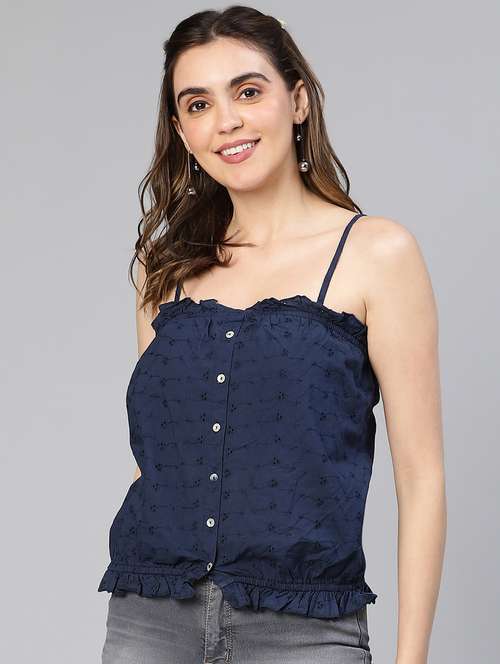 Hit the summer fashion in all trendy ways with a Figured blue button-down schiffli women's cotton top. Made with cotton fabric, it is styled with an over-schiffy fabric pattern for a flawless look. it has a thin shoulder strap, a placket of white buttons, and a round hemline. Pair this top with white or black pants and look bang-on classy and trendy this season.