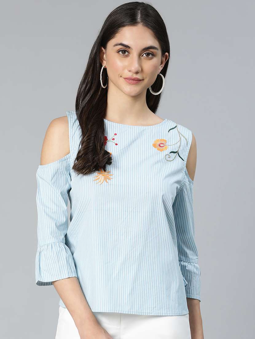 Roll in trend by wearing this Windy blue stripe & embroidered cold shoulder women's top and feast on your occasion with your amazing look. Made with rich cotton fabric, it features an all-over stripe along with embroidery near the neckline, cut-outs on the shoulder, a short sleeve, and a curved hem with a length to the waist. To get the prominent look, style this with nice-looking bottom wear and get streak out the fashionista outside you