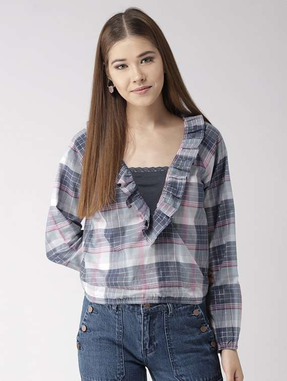 ruffle trim checkered top