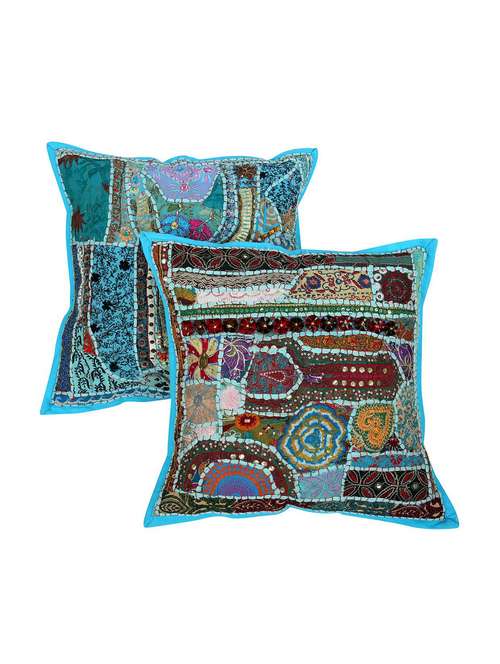 - » blue ethnic pattern 17 x 17 inches cotton flap closure patch work set of 2 cushion cover by rajrang
