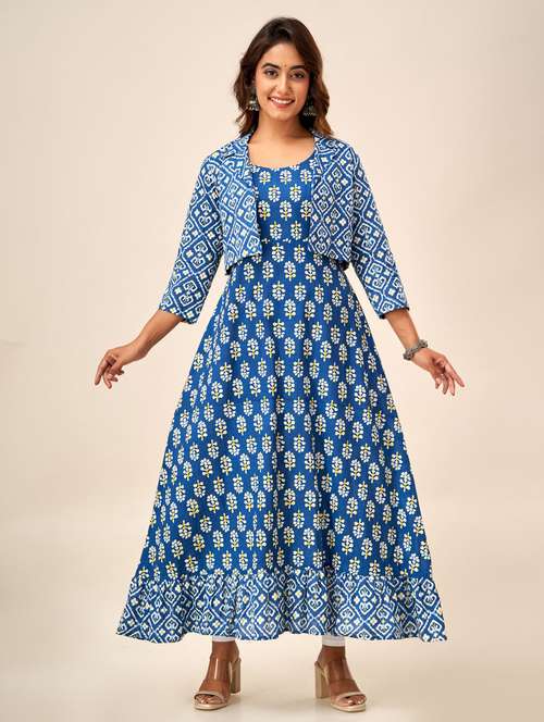 blue printed kurta with jacket