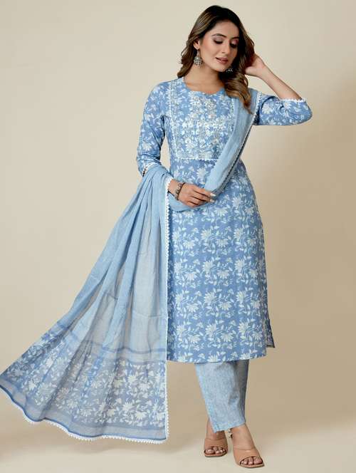 - Find gorgeous sets of ethnic wears in trending designs in light blue colors suitable for casual wear of occasions.