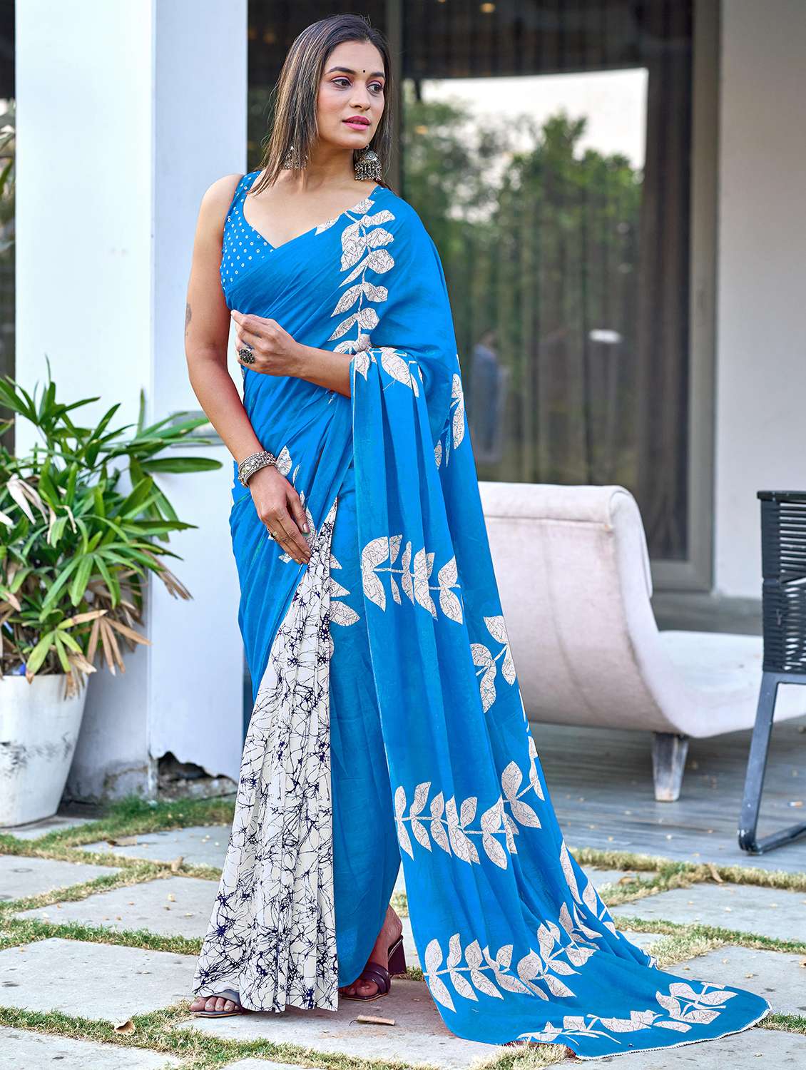 women blue printed saree with blouse