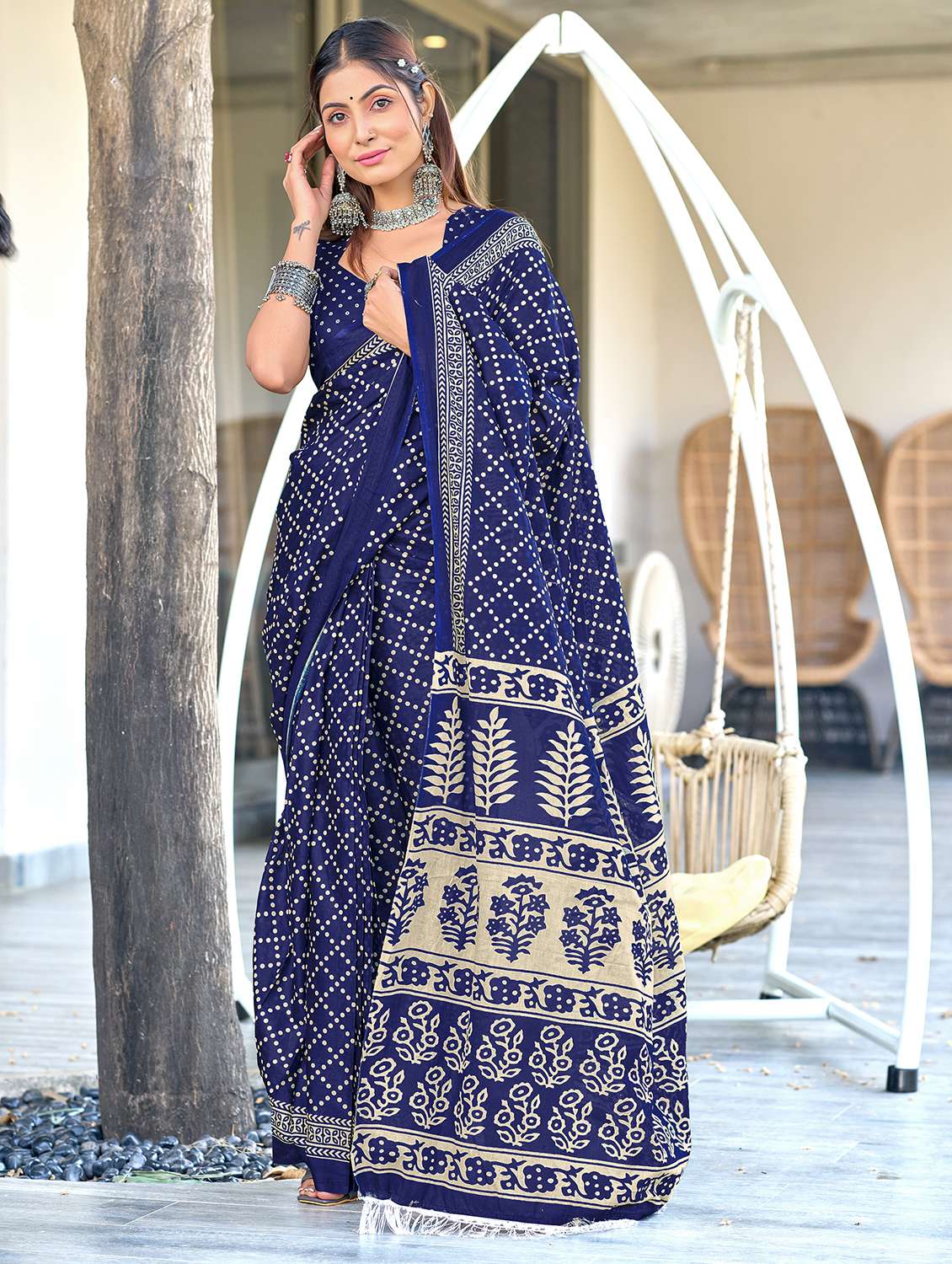 women blue printed saree with blouse