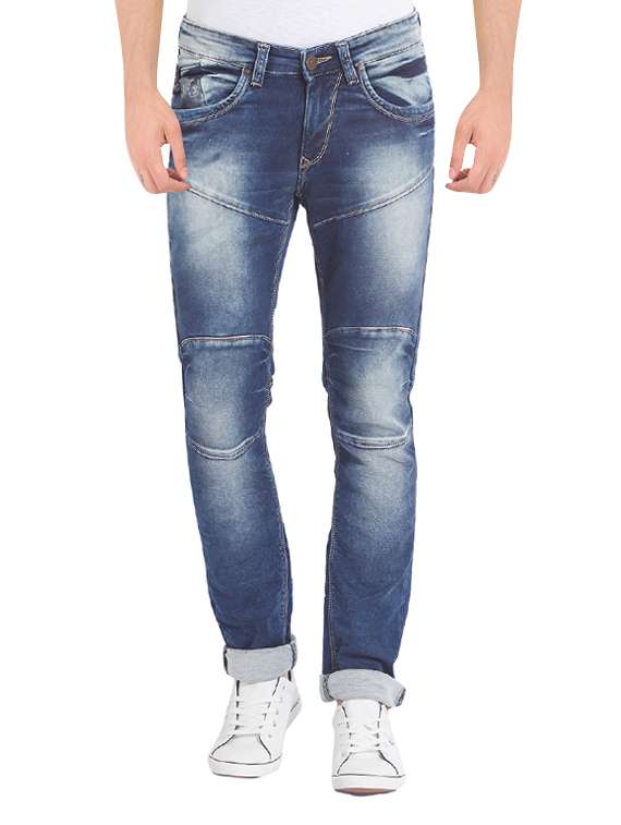 blue heavy washed biker denim jeans