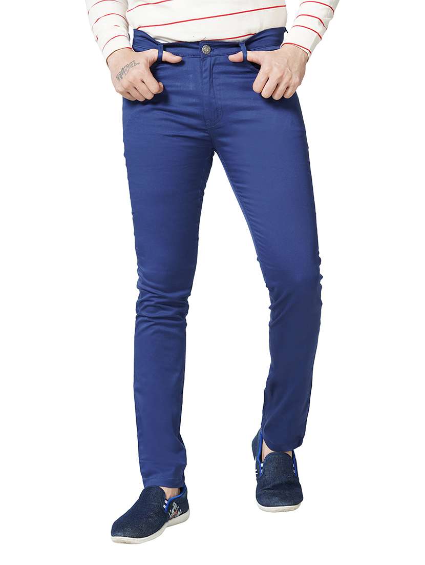 blue solid flat front casual trouser