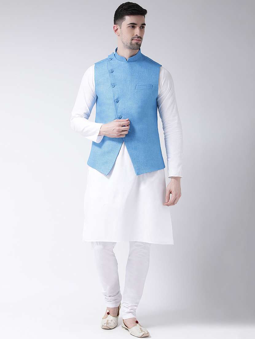 white solid kurta pyjama set with blue nehru jacket