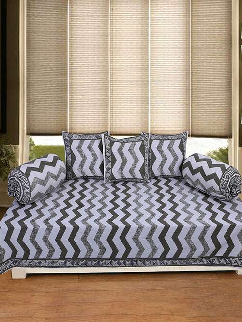 TEXSTYLERS presents you a unique collection of Geometric/Abstract Pattern Block Printed JAIPURI(RAJASTHANI) and Contemporary Diwan Set. The fabric is 100% cotton and colors are light and dark shaded. Package includes - 3 cushion covers, 2 Bolster covers and Single Bed Sheet.