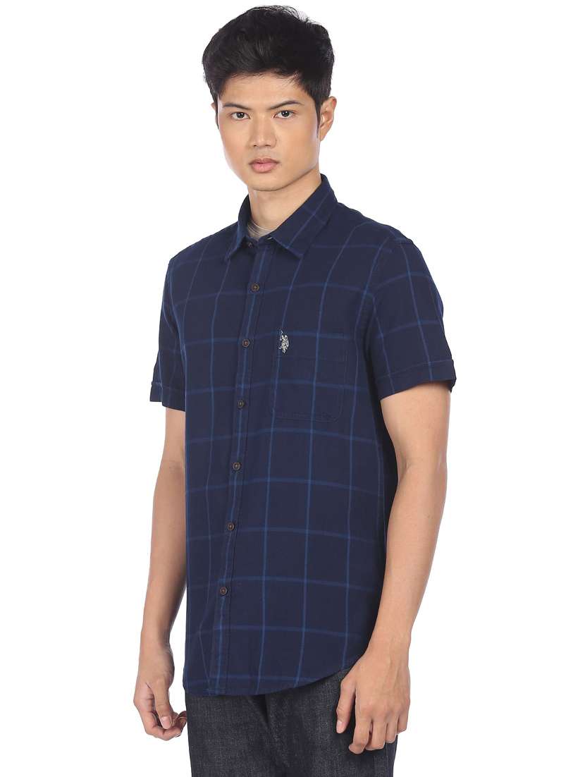 navy-blue checkered casual shirt