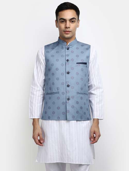 - » men blue printed mandarin neck nehru jacket