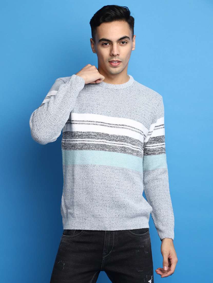 light blue self design striped round neck pullover - 20686812 - Very Small Image - 1