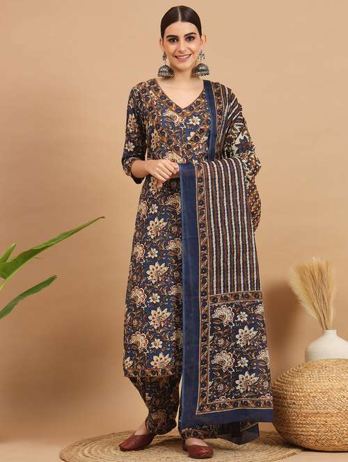 women blue v neck kurta salwar set with dupatta