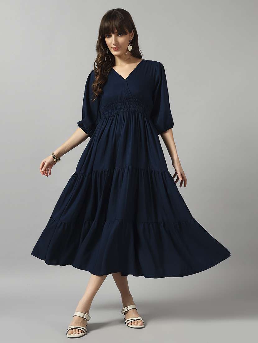 - » women solid puff sleeve tiered dress