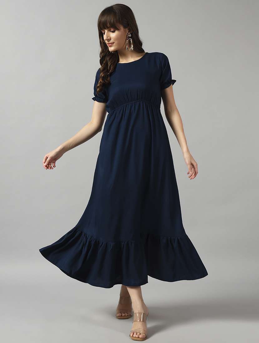 This modern dress comes in Solid long tier dress comes with crossed v neckline and smocking detail at the waist line. The maxi dresses for women western wear has fine gathers on the shoulder which gives it an appeal. This beautiful dress can be worn with a belt to make a more stylish look. It is crafted from polyester fabric.It is a western dresses for women latest design party.