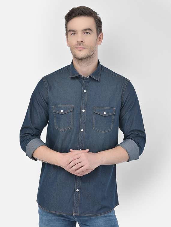 - » blue solid denim casual shirt