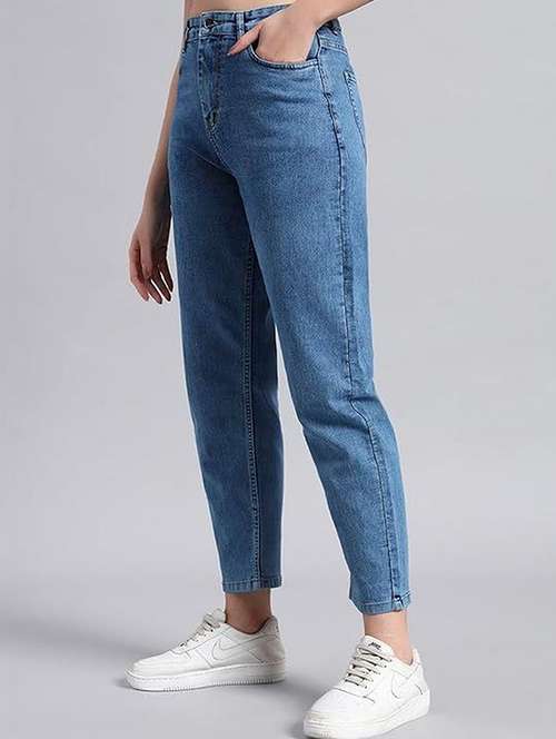 - Choose from the trendy assortment of mom fit jeans in a variety of blue colors and timeless designs to complete your clothing essential list.
