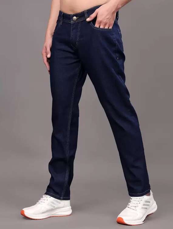 men navy blue plain mid rise relaxed fit jeans