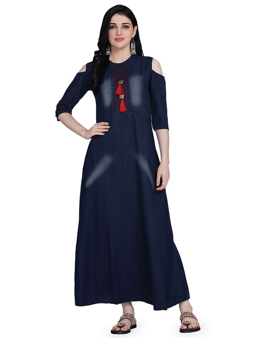 - Grab this beautiful kurta made up of denim fabric featuring round neck designs.