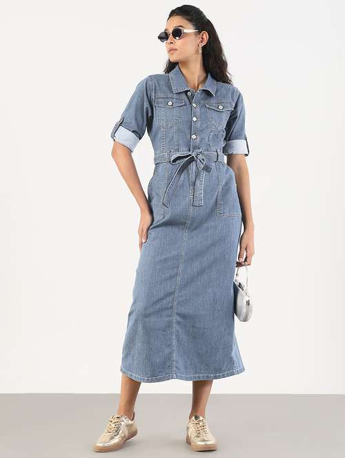 - Dress up in a soothing pattern and don this dress made of denim material.