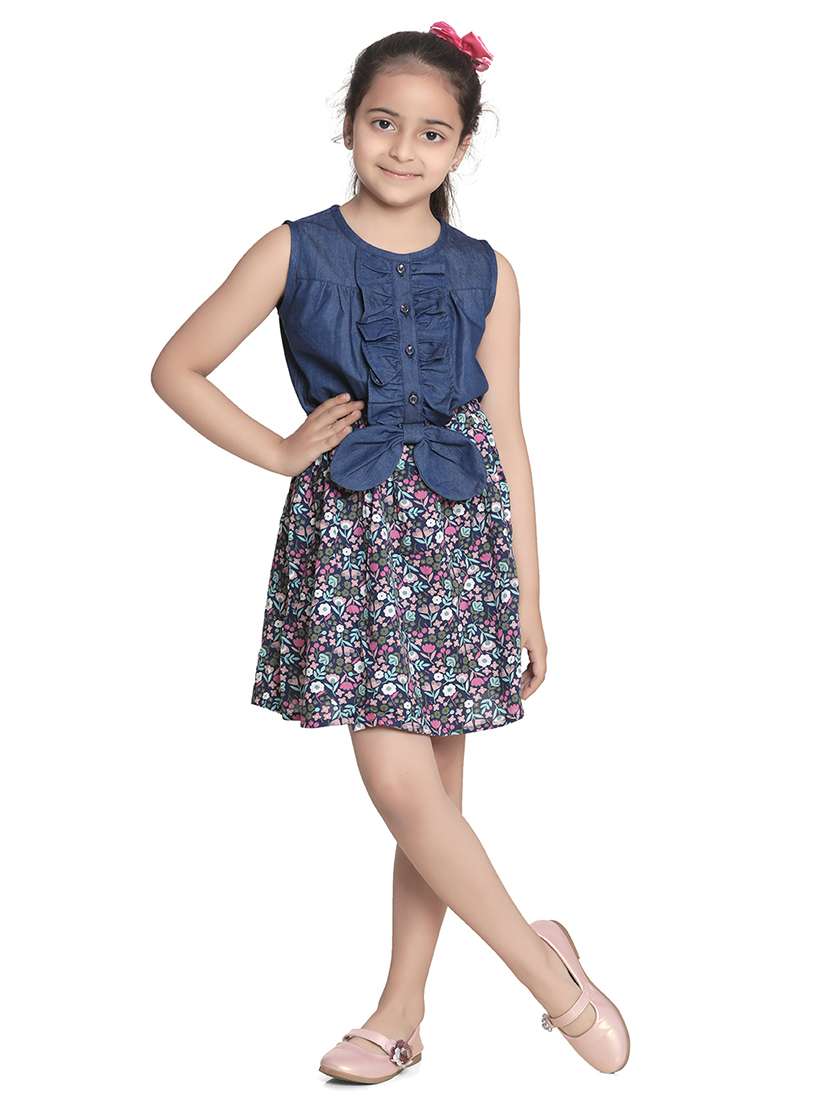 - Dress up your little ones in frocks featuring pretty patterns in denim .
