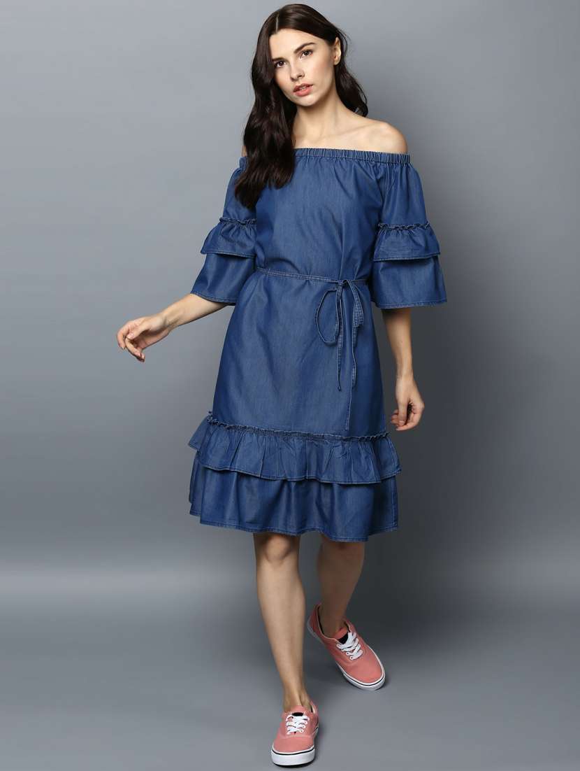 - Dress up in a soothing pattern and don this dress made of denim material.
