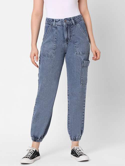 blue solid high rise jogger jean