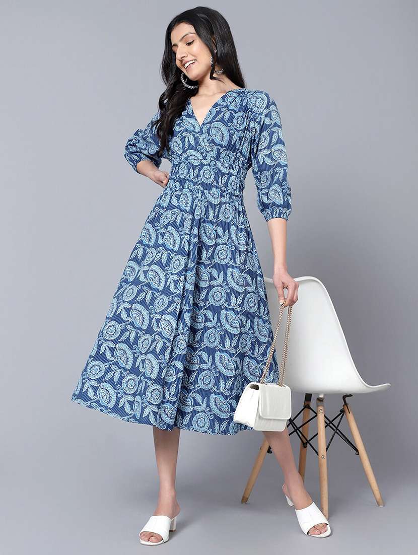 - » women blue three quarter sleeve flared ethnic dress