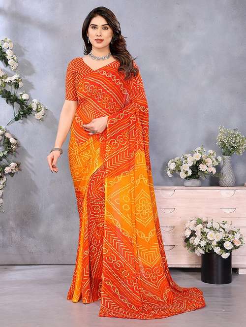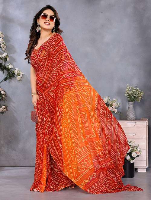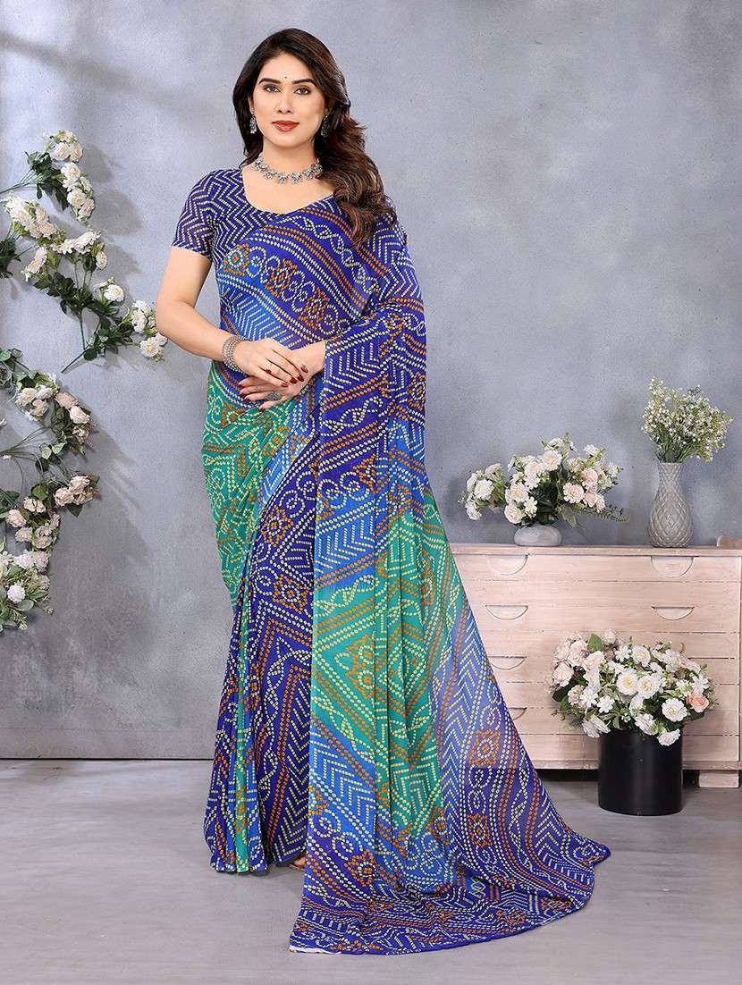 Celebrate timeless tradition with this elegant Bandhani print georgette saree. Made from soft, flowy georgette fabric, this saree showcases vibrant Bandhani patterns that reflect rich cultural heritage. Lightweight and easy to drape, it's perfect for festive occasions, family gatherings, or daily ethnic wear. The bright colors and classic design make it a must-have for women who love traditional charm with modern comfort.