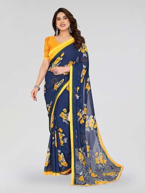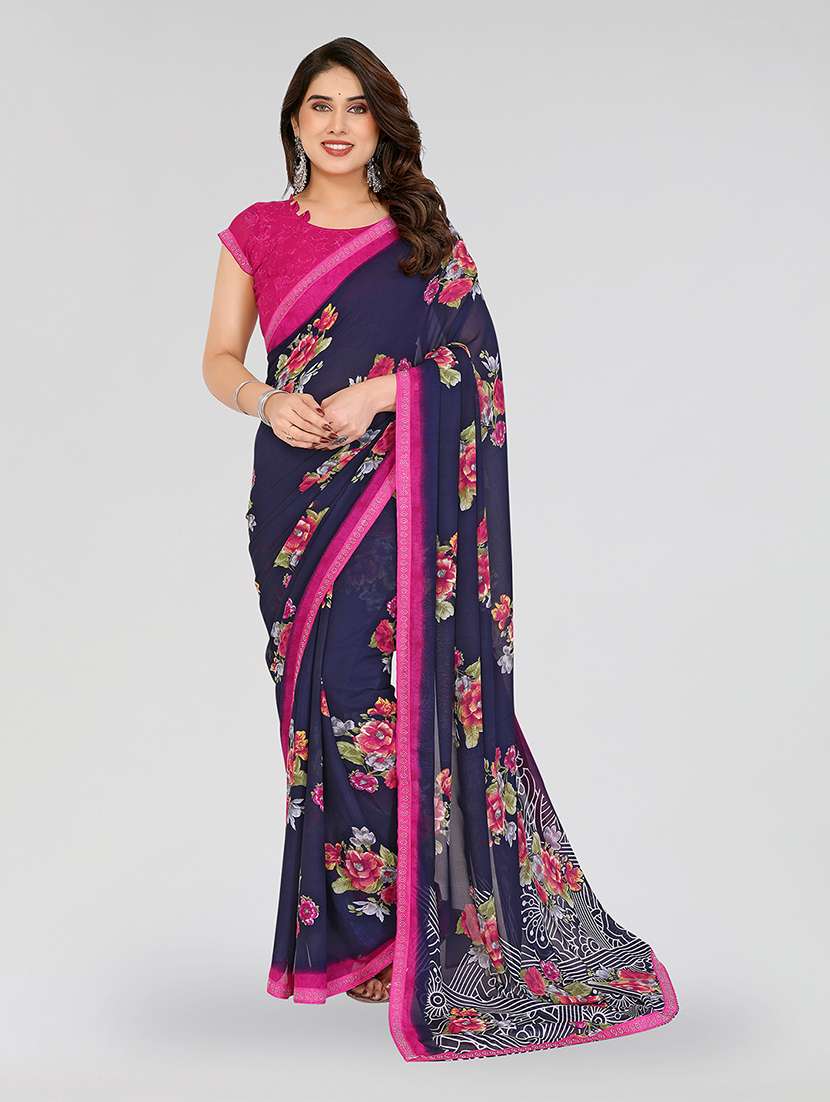 Make a graceful impression with this navy blue georgette saree, adorned with delicate floral prints and subtle embellishments that add a hint of sparkle. The lightweight fabric offers a fluid drape, making it comfortable for all-day wear. Whether you're attending festive gatherings, parties, or special occasions, this saree beautifully blends traditional charm with a modern flair.