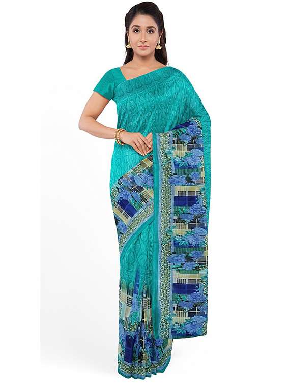 - » women's printed aqua blue colored saree with blouse